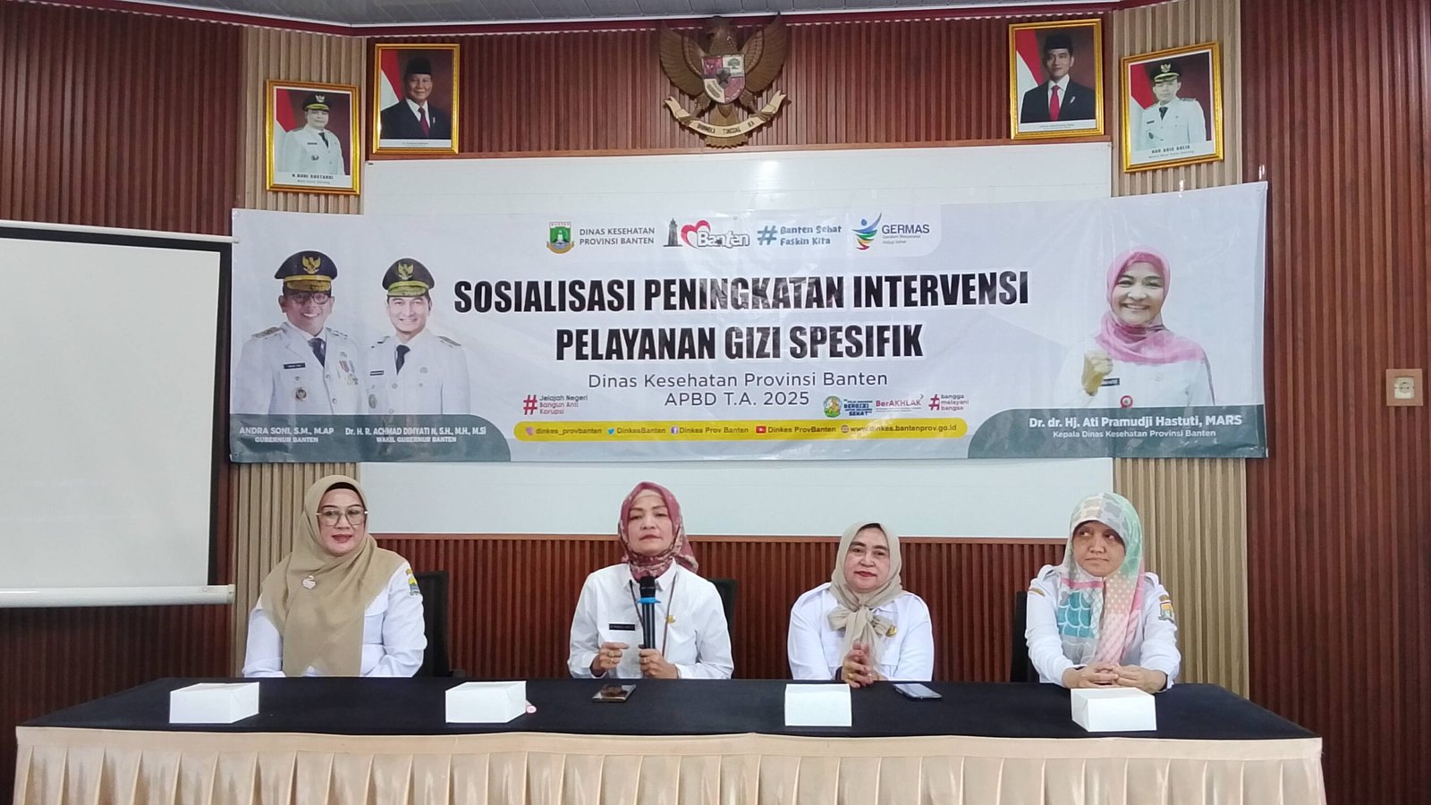 Kadis dinkes provinsi banten, Dr. dr. Hj. Ati Pramudji Hastati, MARS, menjelaskan bahwa indikator kinerja kepala daerah akan di anggap berhasil untuk bidang kesehatan adalah di tentukan oleh 2 hal utama, yang pertama angka harapan hidup dengan meningkatnya kesehatan masyarakat maka angka harapan hidup di suatu daerah akan meningkat, dan yang kedua adalah terkait dengan preparasi stunting, berbicara terkait stunting bukan karena hanya kurang makan, atau karena penyakit, pola asuh yang belum baik, atau kurangnya pendidikan pola asuh ataupun faktor genetik, banyak faktor yang mempengaruhi dan menyebabkan terjadinya stunting, tentunya bukan hanya menjadi tugas bidang kesehatan saja yang menangani stunting, dalam instruksi presiden ada 20 indikator untuk menurunkan angka stunting, dan sembilan di antaranya adalah kewajiban bidang kesehatan dan sebelas indikator lainnya adalah kewajiban dari berbagai lintas sektor, oleh karenanya dalam memaksimalkan program intervensi pelayanan gizi spesifik ini harus ada campur tangan dari kepala daerah, dan juga sudah menjadi tanggung jawab bersama baik pemerintah, dinas terkait maupun masyarakat khususnya. ” Ungkap Hj. Ati Pramudji Hastati.