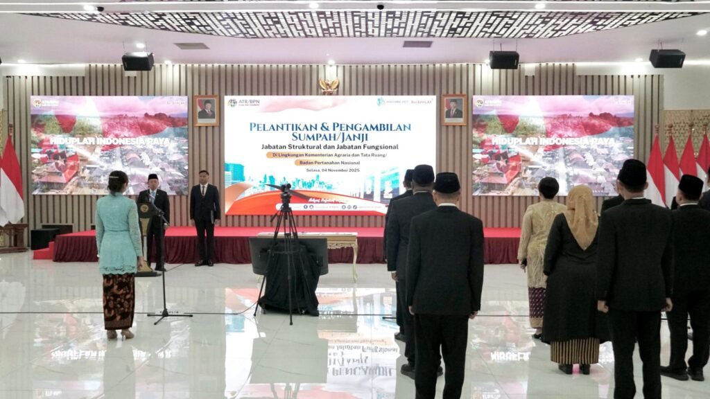 Penaindonews.com, Jakarta – Jabatan adalah amanah yang harus dijaga dan dimanfaatkan sebaik-baiknya untuk kepentingan masyarakat. Hal ini jadi pesan utama Menteri Agraria dan Tata Ruang/Kepala Badan Pertanahan Nasional (ATR/BPN), Nusron Wahid, saat melantik 840 Pejabat Struktural dan Fungsional di lingkungan Kementerian ATR/BPN pada Selasa (04/11/2025), di Aula Prona, Kementerian ATR/BPN, Jakarta.