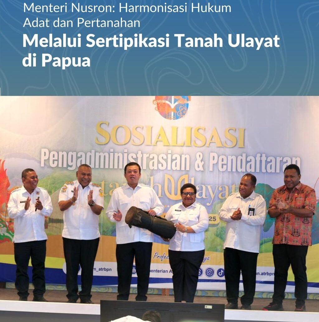 “Jadi (sertipikasi) ini namanya sinergi hukum adat dan hukum pertanahan nasional. Hukum pertanahan nasional bisa jalan, hukum adatnya terlindungi, jadi sinergi dan harmoni,” tegas Menteri ATR/Kepala BPN, Nusron Wahid, saat membuka Sosialisasi Pengadministrasian dan Pendaftaran Tanah Ulayat, di Kantor Gubernur Papua, Rabu (19/11/2025).