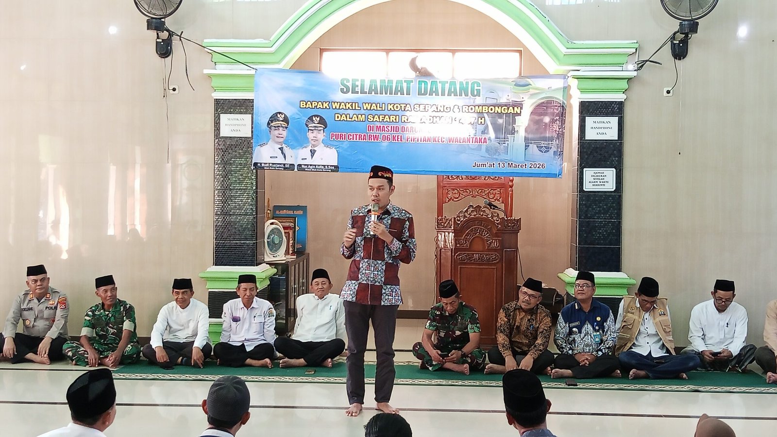 Penaindonews.com, kota serang,- Camat walantaka, Muslim Sholeh, sambut dan dampingi wakil walikota serang Nur Agis Aulia, dalam kegiatan Safari Ramadhan 1447H, di Masjid Darurrohman, lingkungan puricitra RW 06, kelurahan pipitan kecamatan walantaka, kota serang. Jum’at (13/03/2026).