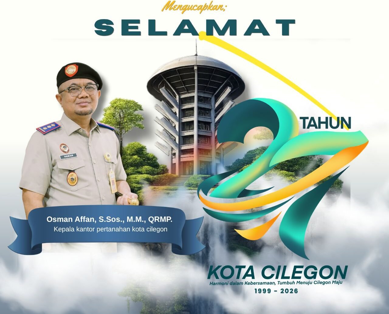 Kantor Pertanahan Kota Cilegon berkomitmen untuk terus mendukung pembangunan melalui pelayanan pertanahan yang profesional, transparan, dan akuntabel, sebagai bagian dari kontribusi nyata dalam memajukan Kota Cilegon, Selamat Hari Jadi ke-27 Kota Cilegon, Bersama, kita wujudkan masa depan yang lebih baik.